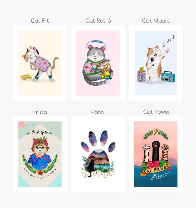 Ilustrações que celebram minha paixão pelos felinos, com cores suaves, referências vintage, pitadas de arte e cultura pop - e claro, muito ronron em cada pincelada.