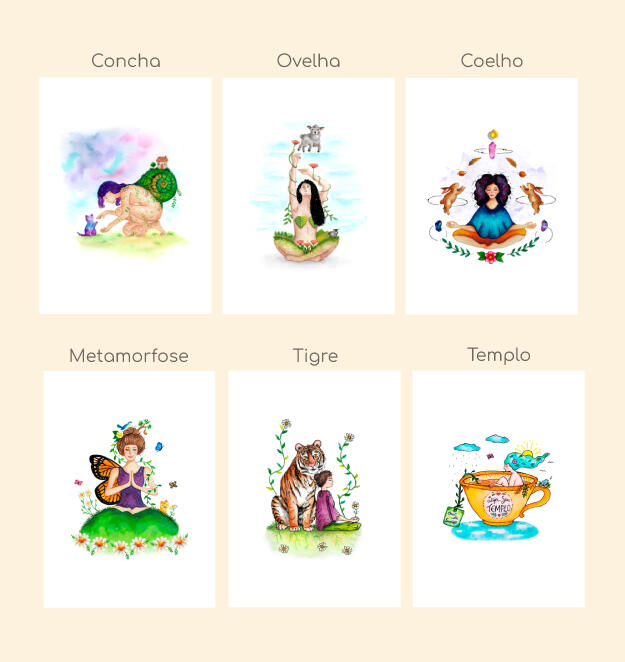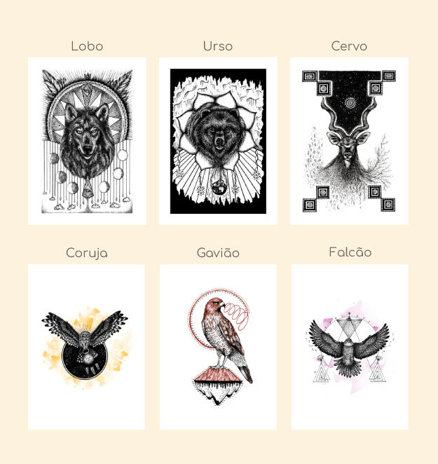Trabalhos que transmitem a simbologia de cada animal através dos elementos da composição, agregando força e consciência de que também fazemos parte dessa Natureza ancestral.